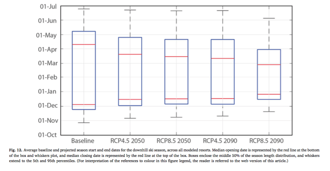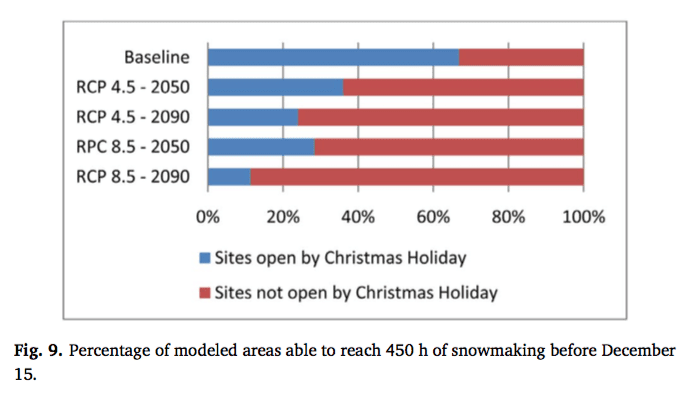 “Based on our modeling, the difference between RCP4.5 and RCP8.5 [the lowest and highest emissions scenarios] could represent the difference between preserving skiing and snowmobiling in the eastern half of the country and losing these activities almost completely by 2090,” states the study in the conclusions section.