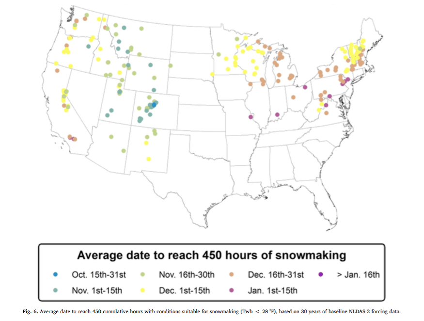 The authors use a “physically based water and energy balance model” to simulate natural snowfall at 247 ski resorts around the U.S. Factoring in snowmaking, this model forecasts season lengths based on data from five climate models and two emissions scenarios. With the combined scenarios, the model equates to running 300,000 years’ worth of possible outcomes.