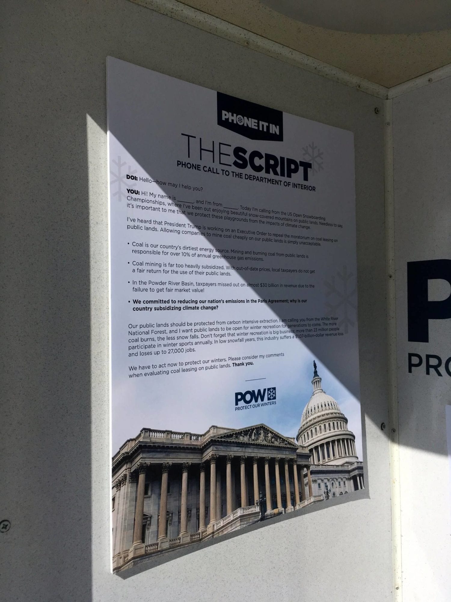 We had never asked our community to call their elected officials before, let alone from a wooden-constructed phone booth at the base of a halfpipe. Needless to say, we were unsure of what to expect. But after providing some background on the Clean Power Plan, environmental voting records for senators, contact information for said senators, a script asking these senators to support the CPP, and even flip phones, we were blown away when at the end of the week as nearly 300 visitors had made calls. This year, we were excited to head back to the Burton US Open, this time, upping our game by showing up with a real phone booth. As in, an actual phone booth. Remember those?
